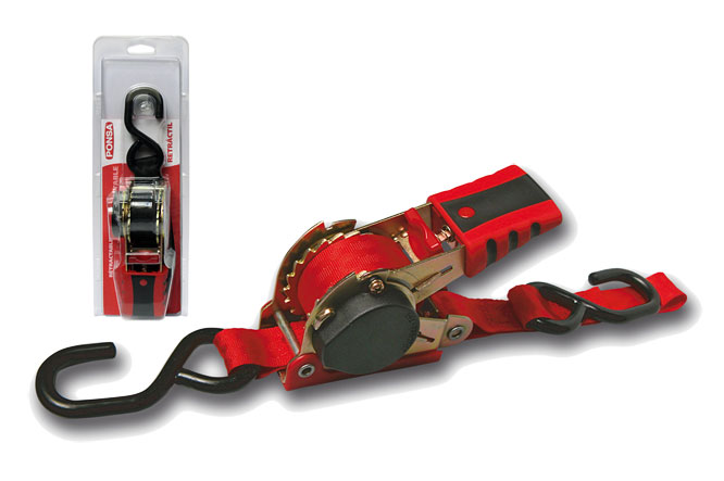 Ratchet retráctil con cinta de 25 mm de ancho.�Longitud: 2,4 m.�Color: rojo.�Extensible, con cajetín de plástico que recoge la cinta sobrante. �Resistencia: 500 kg.�Dos ganchos cerrados.�Cumple con la normativa EN 12195-2:2001.